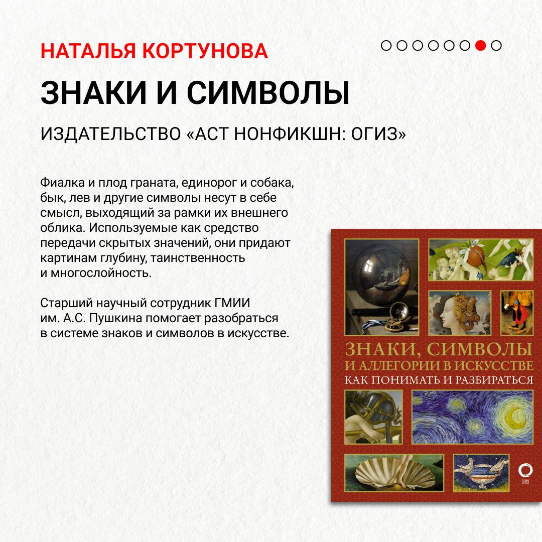 Среди изданий — книга Натальи Кортуновой. Автор помогает разобраться в системе знаков и символов в искусстве.