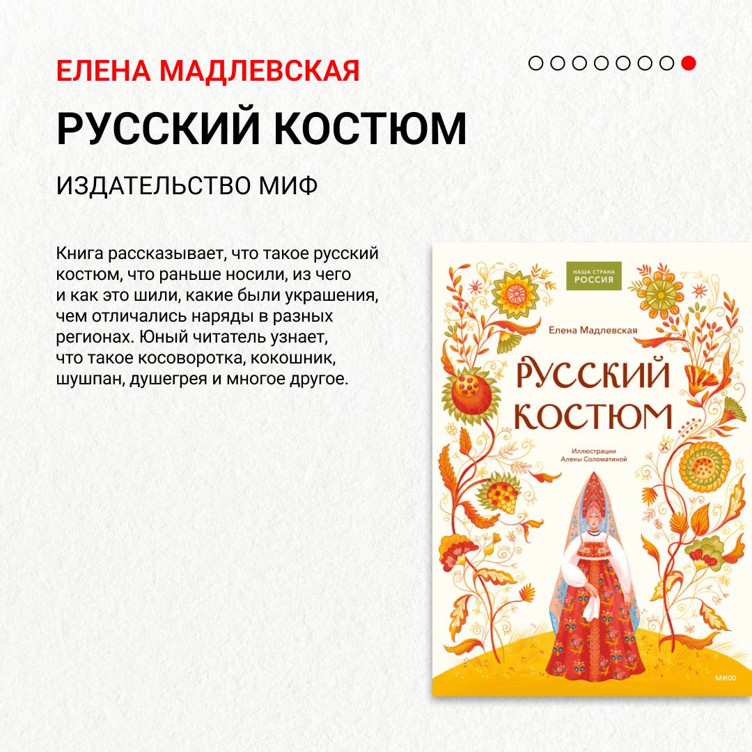 В книге Елены Мадлевской рассматривается, что такое русский костюм, из чего и как его шили, какие были украшения, чем отличались наряды в разных регионах.