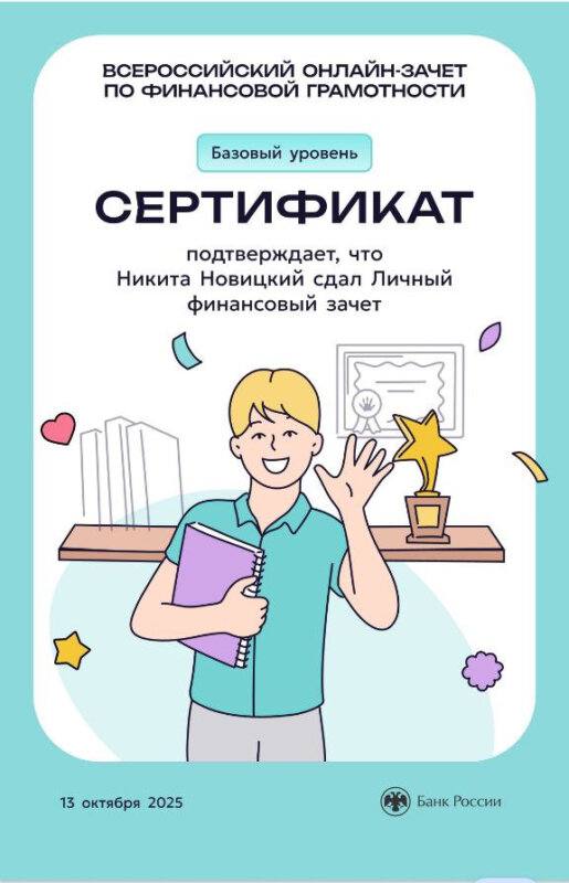 С 7 по 28 октября проходит VIII Всероссийский онлайн-зачет по финансовой грамотности от Банка России Это уникальная возможность проверить свои знания, получить полезные рекомендации и собрать коллекцию достижений Каждый участник, успешно завершивший зачет, получит именной сертификат с личными результатами