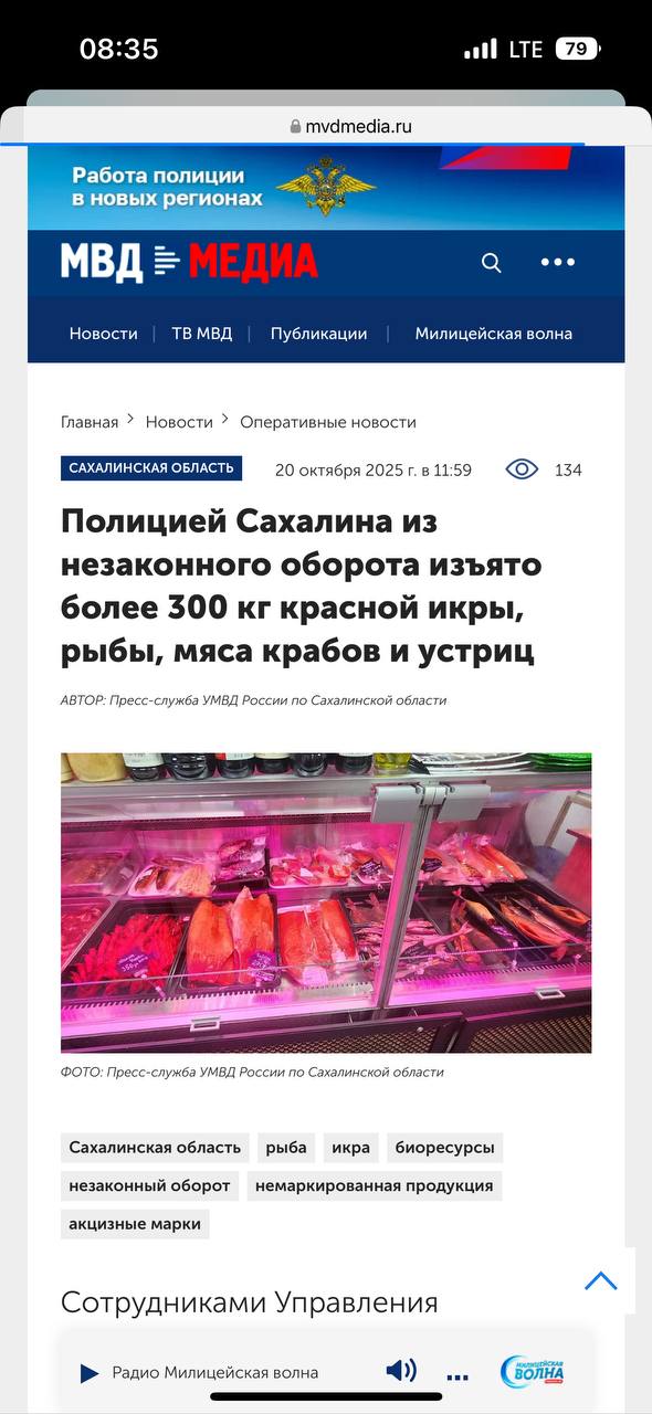 В результате проведенного комплекса оперативно-розыскных мероприятий в торговой точке и месте переработки была обнаружена немаркированная продукции, включая лососевую икру, мясо и фаланги краба, рыбу (кету, форель, сима), устрицы общим весом свыше 300 килограмм на общую сумму свыше 950 тысяч рублей.