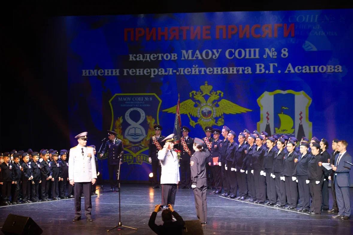 Центральным событием первой части торжества стало принятие клятвы кадетами 1 и 10 «П» классов. Под звуки марша и Гимна России, в исполнении солистки Сахалинской филармонии Ярославны Калашниковой, на сцену было вынесено Знамя УМВД. Перед лицом своих наставников, родителей и коллег-полицейских юные воспитанники дали торжественное обещание быть верными кадетскому братству и своей Родине.