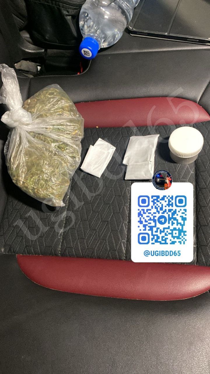 В ходе досмотра транспортного средства на заднем пассажирском сидении была найдена куртка, в нагрудном кармане которой была обнаружена поастиковая банка с веществом растительного происхождения со специфическим запахом, во внутреннем кармане найдены два бумажных свертка с веществом растительного происхождения со специфическим запахом. Также на заднем пассажирском сидении находился рюкзак, внутри которого обеаружен и изъят полиэтиленовый пакет с растительным веществом со специфическим запахом.На место была вызвана следственно-оперативная группа.