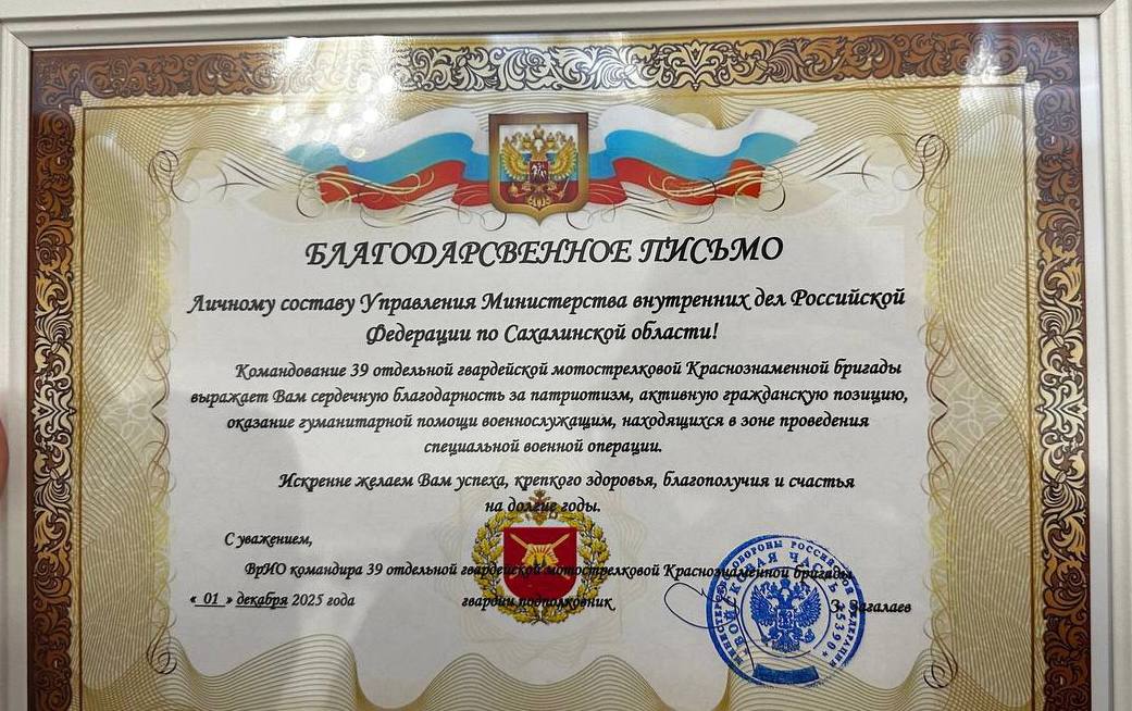 В этот знаменательный день руководство бригады выразило особую благодарность за поддержку личному составу УМВД России по Сахалинской области, а также членам Общественного совета при УМВД, входящим в многонациональную команду «Сахалин За наших». Их активная гражданская позиция, патриотизм и постоянная гуманитарная помощь, направляемая военнослужащим в зону СVO, стали важным вкладом в общее дело.