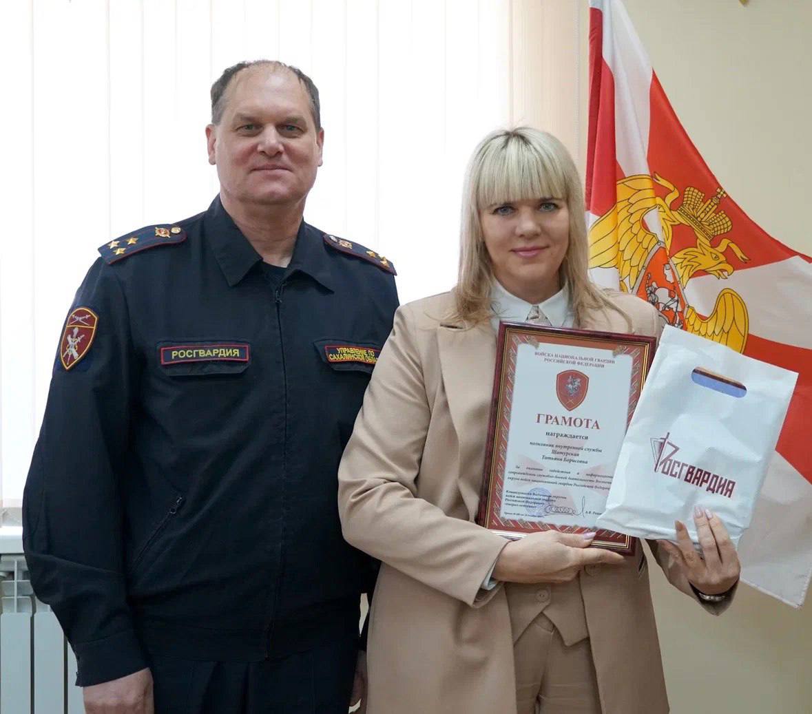 Мероприятие началось с торжественной части. За личный вклад в информационную поддержку служебно-боевой деятельности Росгвардии и укрепление межведомственного взаимодействия полковник полиции Виталий Сендзюк вручил начальнику отдела информации и общественных связей УМВД России по Сахалинской области, полковнику внутренней службы Татьяне Шатурской, грамоту от командующего войсками Восточного округа войск национальной гвардии Российской Федерации генерал-лейтенанта Александра Решетникова.