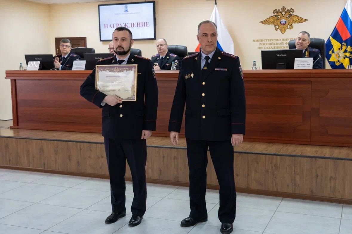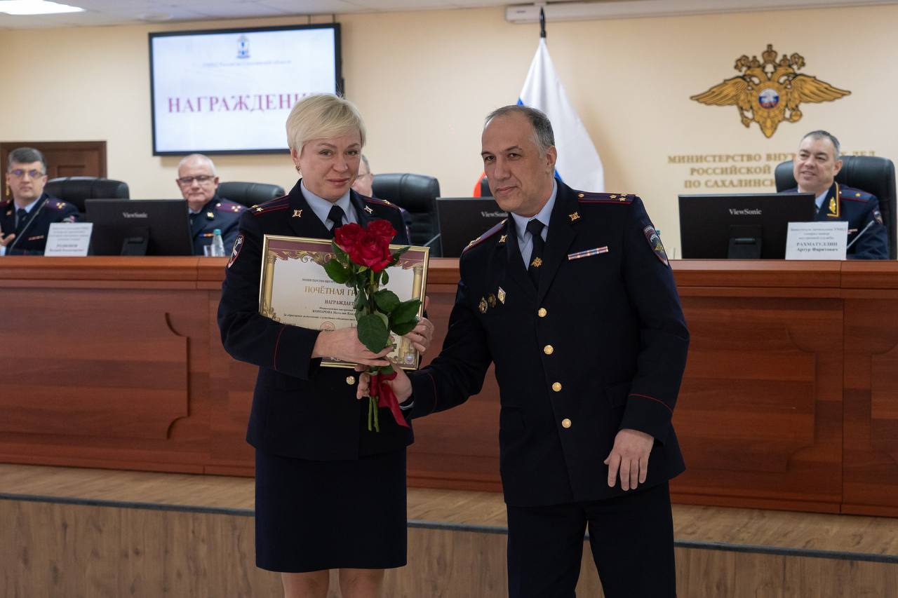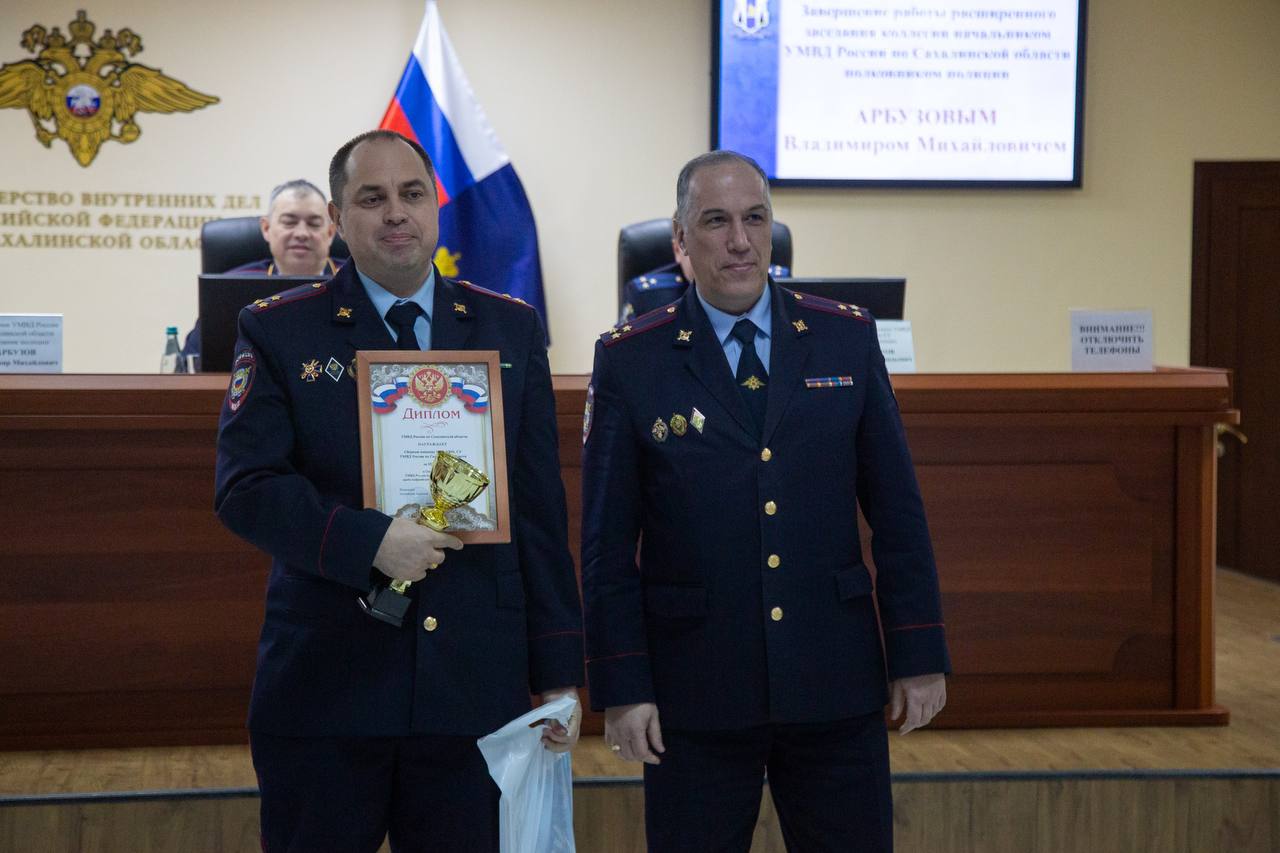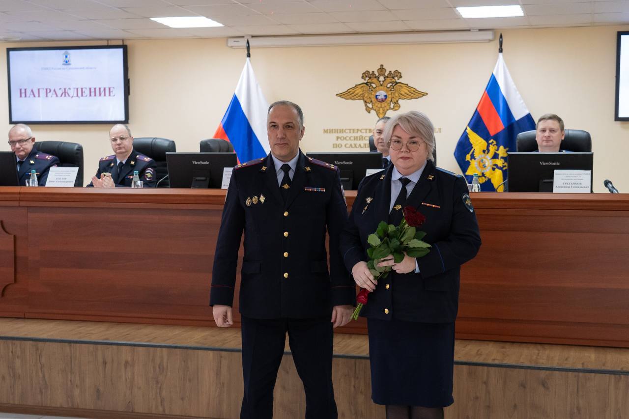 Во второй, части заседания были отмечены сотрудники, отличившиеся в служебной деятельности. Наградным оружием пистолетом Лебедева был награжден начальник Управления уголовного розыска полковник полиции Павел Владимирович Буданов. Заместителю начальника следственного управления МВД Южно-Сахалинск Елене Винеровне Незамеевой присвоено очередное специальное звание полковника юстиции. Медалью За боевое содружество награжден заместитель начальника управления начальник отдела по противодействию IT-преступлениям полковник полиции Андрей Гейнерович Ким. Почетной грамотой МВД России были отмечены еще шестеро сотрудников различных подразделений УМВД, включая руководящий, оперативный состав и специалистов тыловых служб.