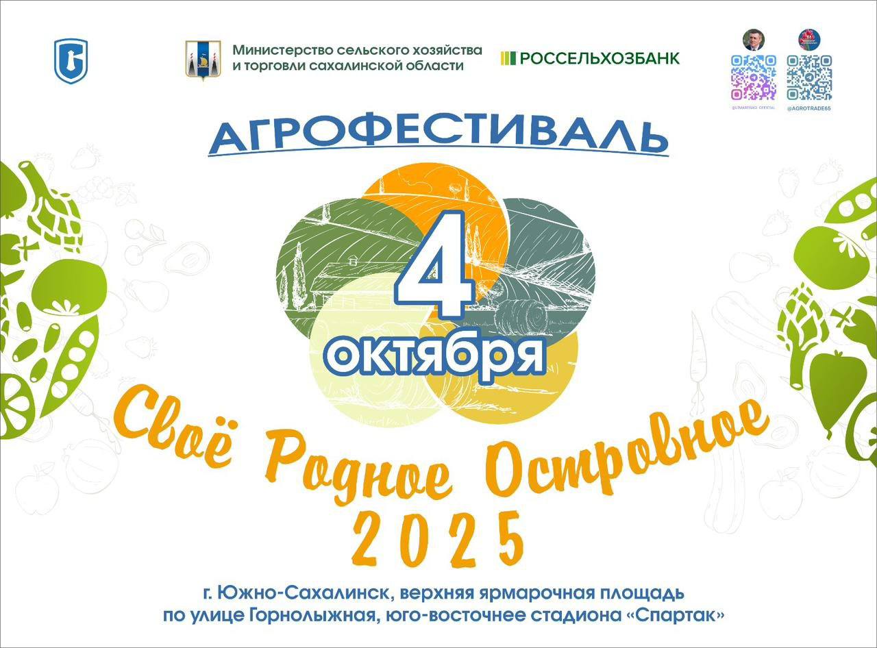 В эту субботу, 4 октября, с 9:00 до 16:00 часов в Южно-Сахалинске состоится осенний агрофестиваль «Своё Родное Островное-2025» на верхней площадке по ул. Горнолыжная, расположенной к юго-востоку от стадиона «Спартак».