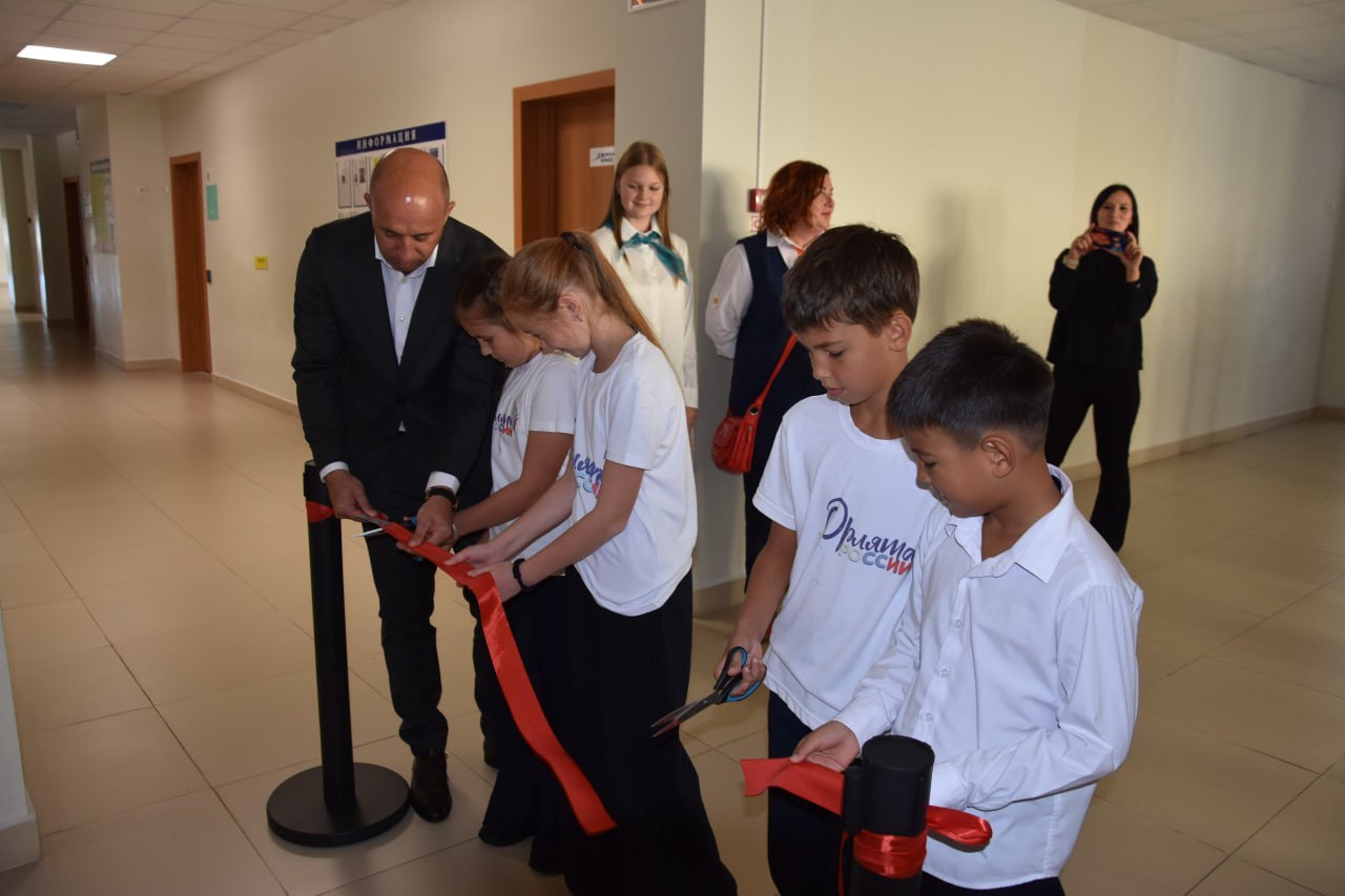 Мэр Долинского района Александр Тугарев открыл на базе школы № 1 в Долинске научный клуб Первых. Он перерезал красную ленту вместе со школьниками.