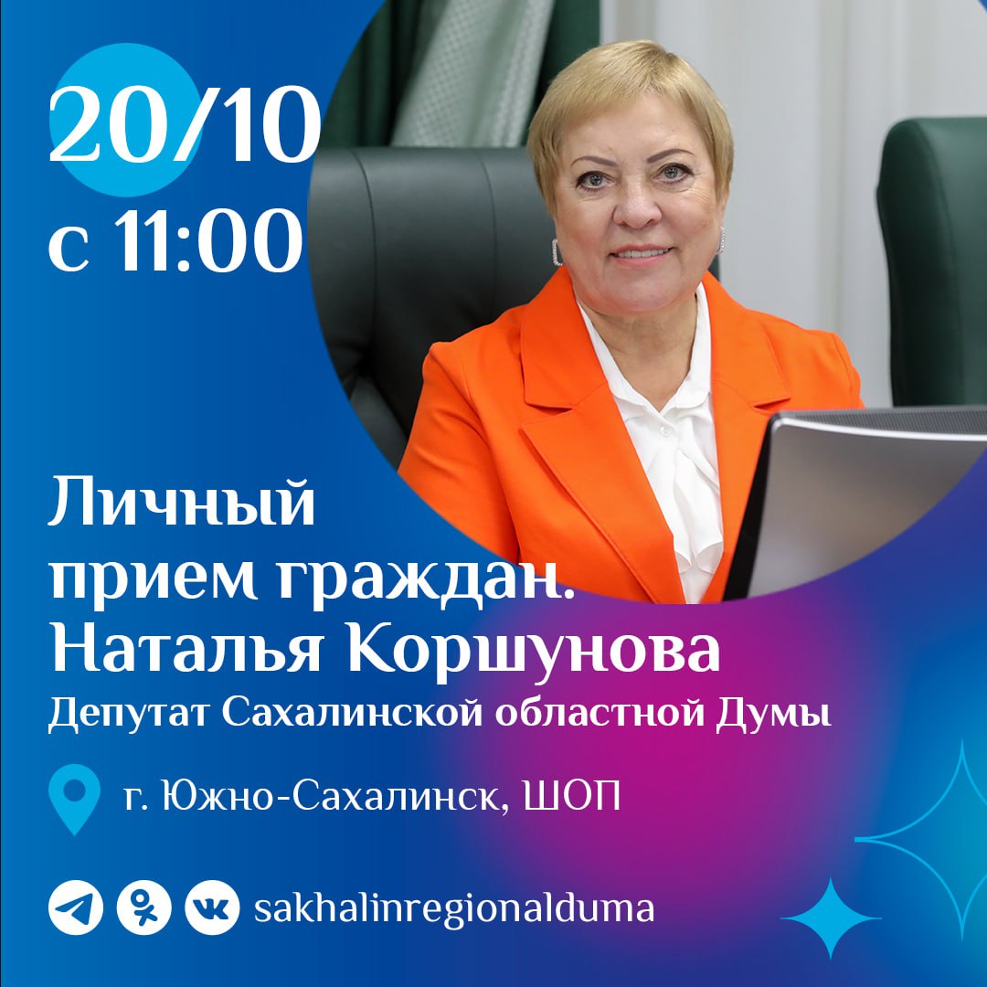 Председатель постоянного комитета по государственному строительству, регламенту и местному самоуправлению Наталья Коршунова проведет личный прием граждан. Прием пройдет 20 октября, с 11:00 до 12:00 в Штабе общественной поддержки партии «Единая Россия» по адресу: город Южно-Сахалинск, улица Дзержинского, 40/1.