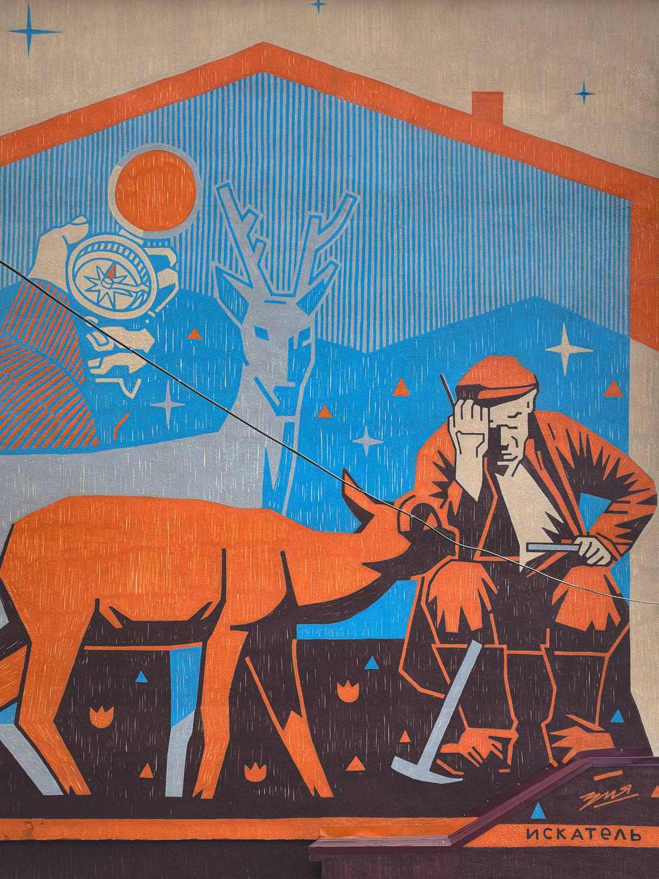 «Работа посвящена советским первопроходцам, геологам и шахтерам, которые прикладывали большие усилия для нахождения и добычи полезных ископаемых в юго-восточной части острова Сахалин.Рука держит компас, и ее крышка превращается в закатное солнце.