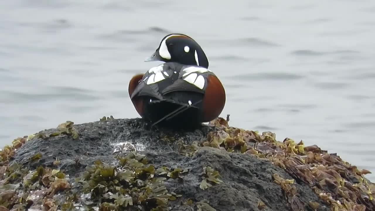 Пока каменушка отдыхает на камне, а оливковый дрозд трапезничает, другая представительница семейства утиных плескается в холодной морской воде.