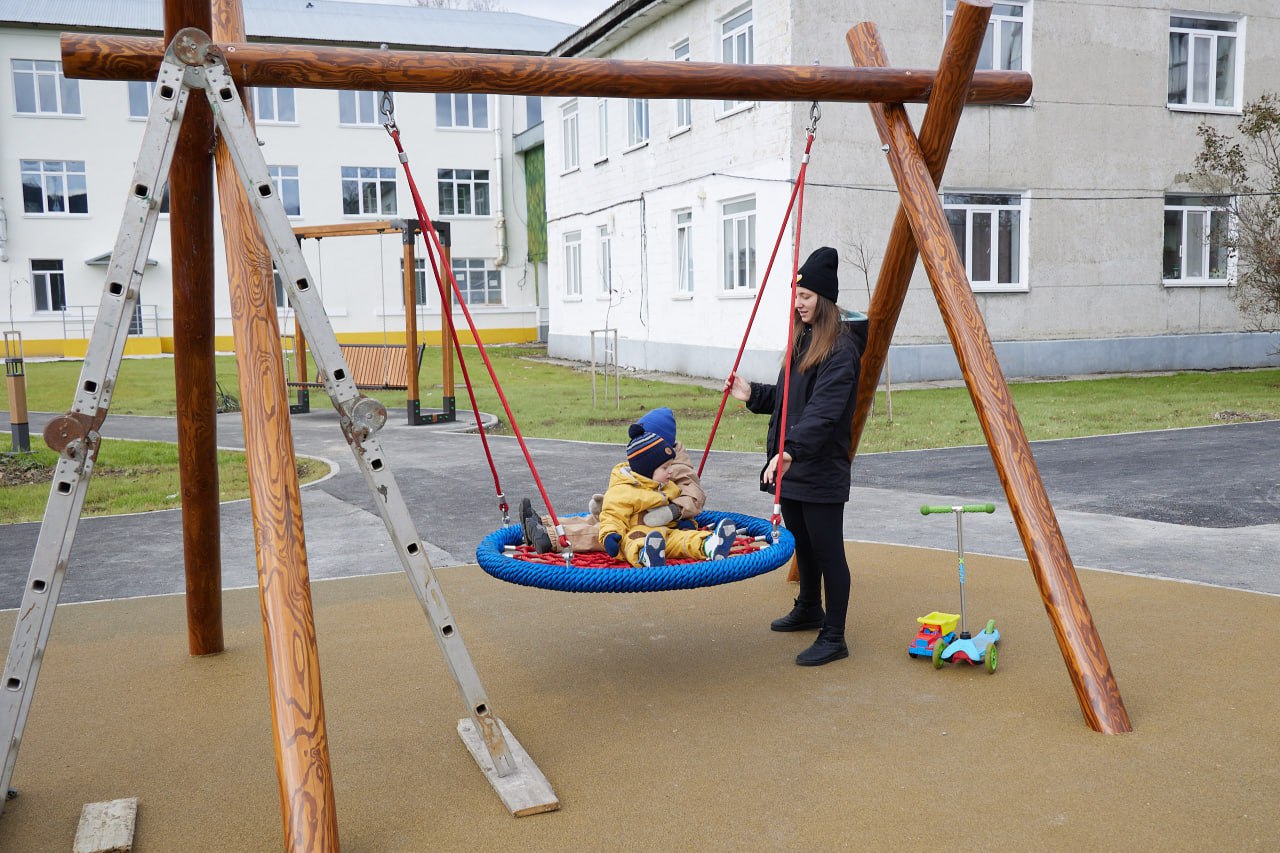 Пространство выбрали жители в рамках проекта «Формирование комфортной городской среды» в 2023 году. На территории сквера установлены современный игровой комплекс для детей и качели-скамейки.