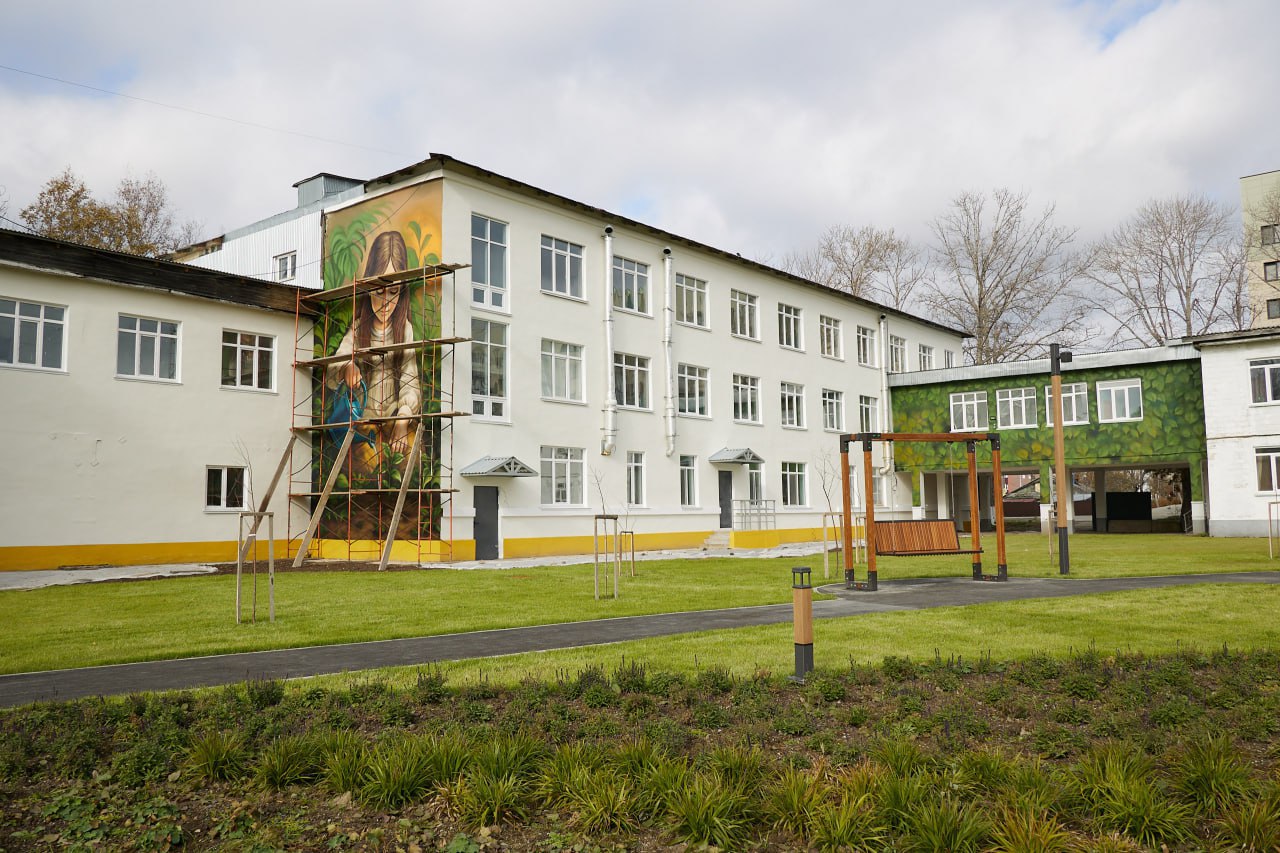 Проложили пешеходные дорожки, высадили аллеи, обустроили парковку, преобразили прилегающую территорию. Фасад соседнего здания украшает яркий мурал,