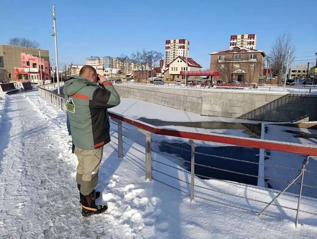 Специалисты Сахалинского зооботанического парка и Агентства лесного и охотничьего хозяйства Сахалинской области провели проверку состояния зимовавшей утки на водоёме в Южно-Сахалинске.