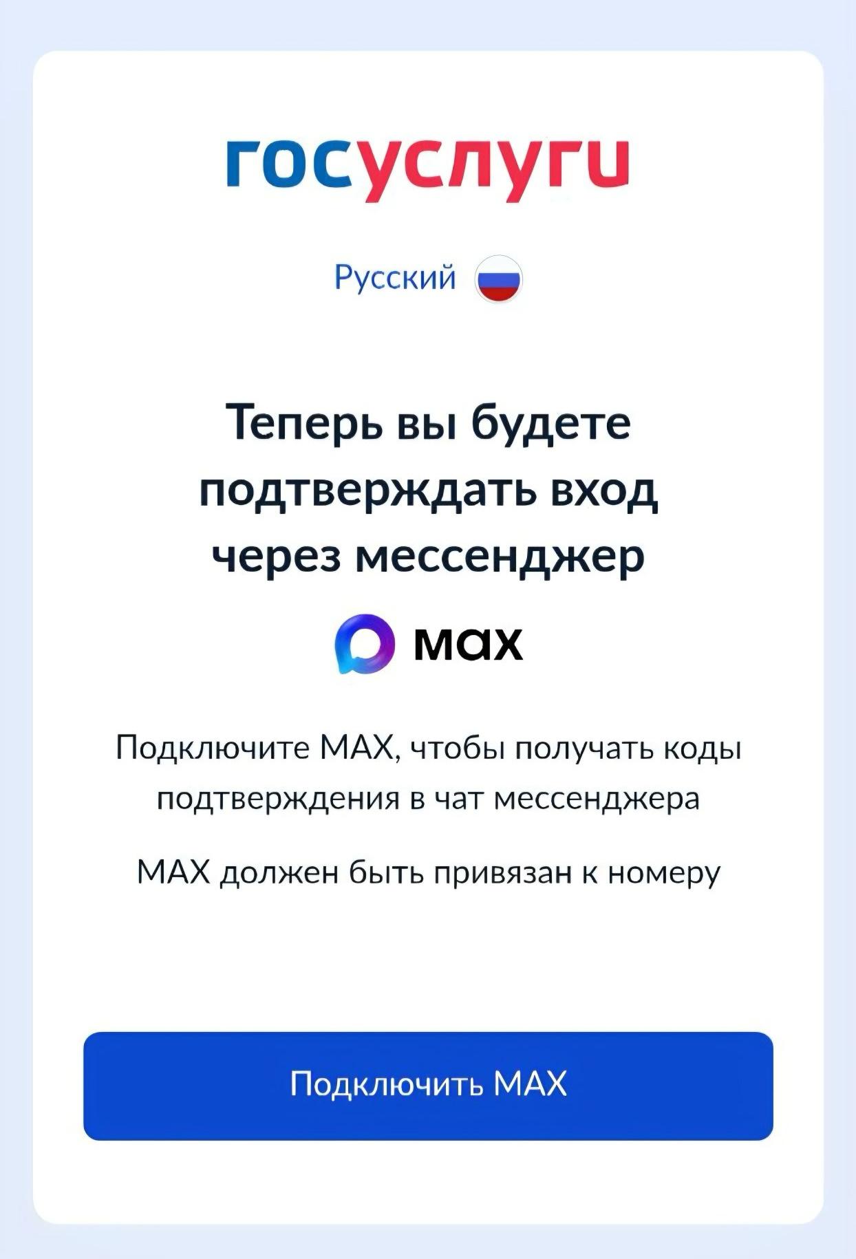 Теперь при попытке войти на Госуслуги россиянам предлагают подключить нацмессенджер MAX, чтобы получать одноразовые коды. Пропустить это сообщение нельзя — кнопки просто нет.