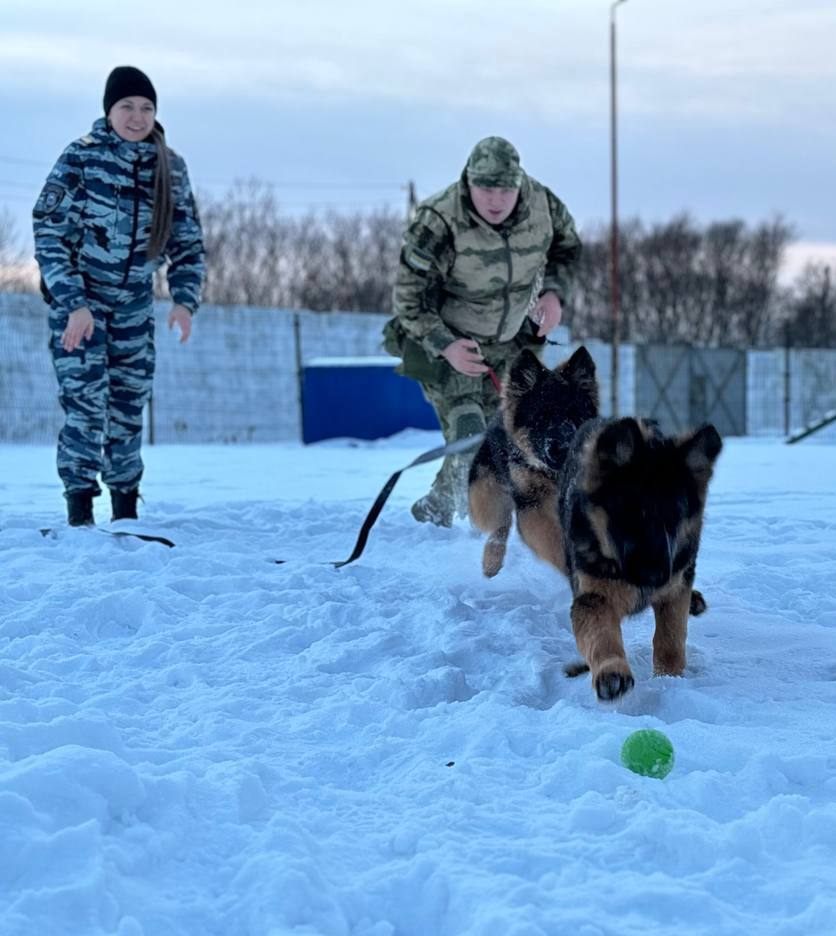 Старший сержант Екатерина Белоножкина, младший инспектор-кинолог ЦКС УМВД России по Сахалинской области, и её игривая подопечная – щенок по кличке "Сердце Амура Эрика". Эрика уже демонстрирует свой характер, обещая вырасти в настоящую служебную собаку, но пока она просто мастер по поднятию настроения!