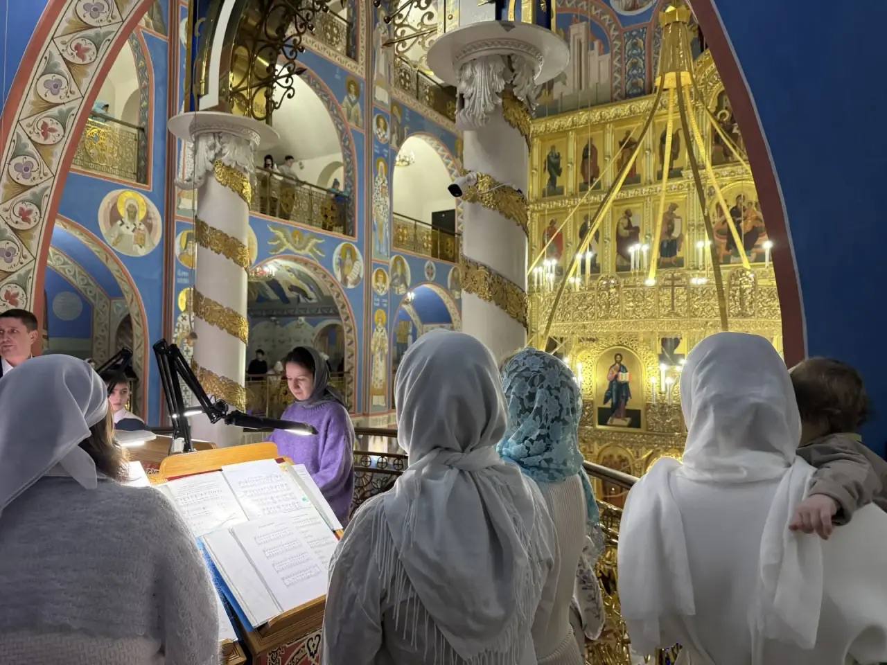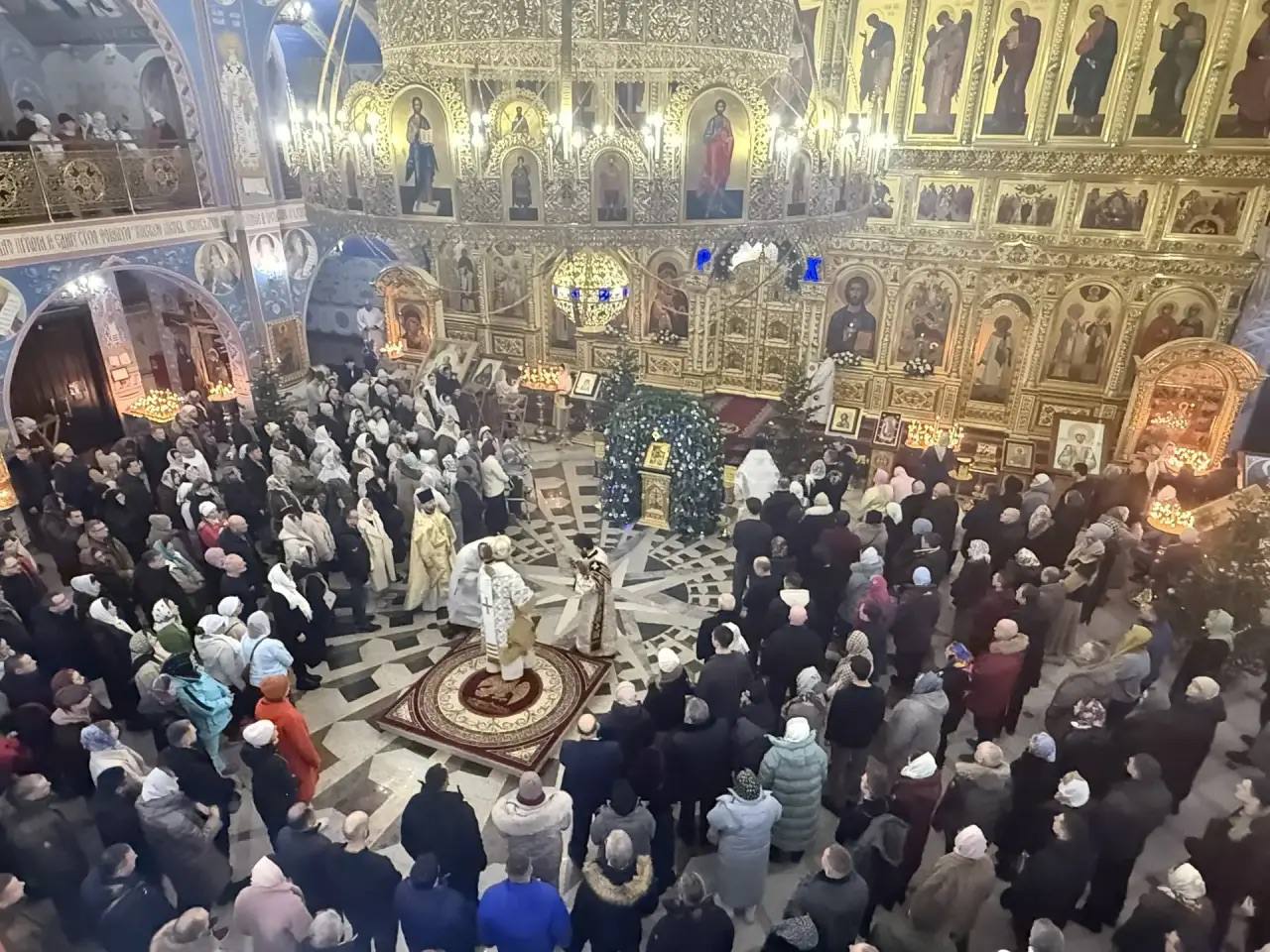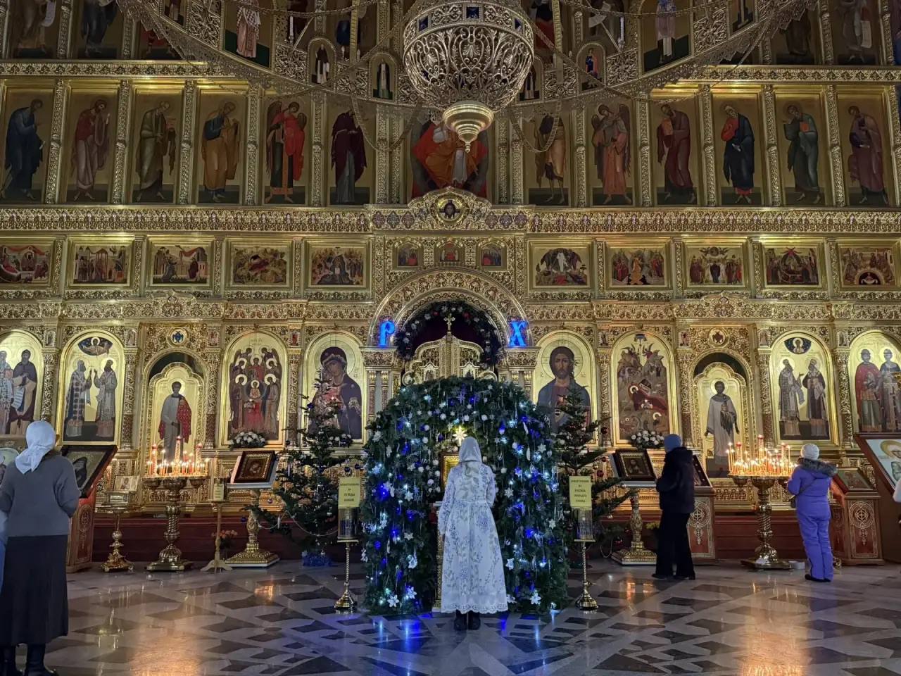 Внутри Кафедрального собора Рождества Христова в Южно-Сахалинске собрались десятки прихожан. В великий праздник пространство украсили еловыми ветвями, установили вертеп и световые буквы. Началась торжественная служба. Ее сопровождает хор. Всего за ночь, в честь великого Праздника, в соборе прозвучит свыше ста песнопений.