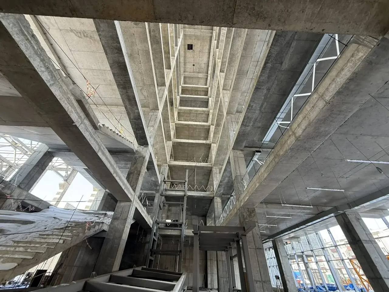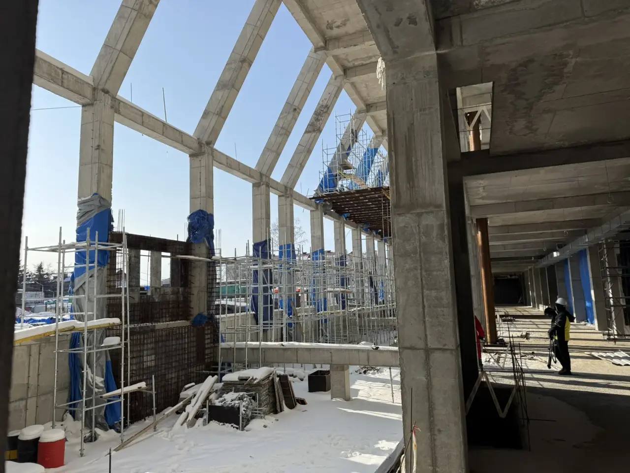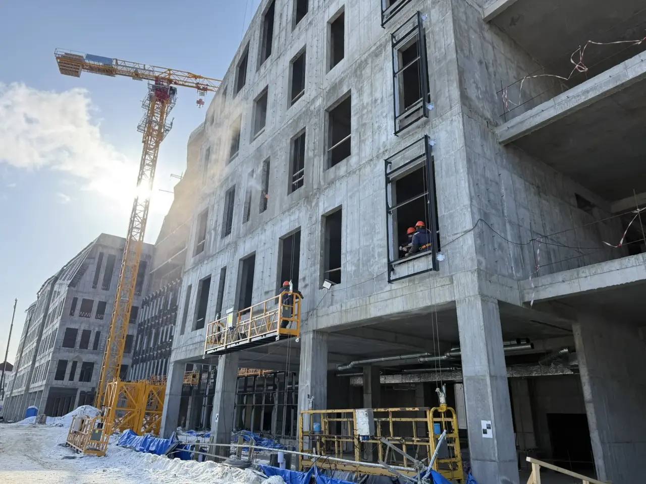 Строители закончили бетонировать первый корпус. Работы по возведению несущих пространств во втором блоке закончат в феврале. Сейчас также остекляют фасады, устанавливают оконные блоки, монтируют систему вентиляции. На следующей неделе начнут прокладывать электричество и водопроводные системы. Работы идут по графику, несмотря на то, что проект масштабный и непростой в исполнении. Так, к примеру, потолки в одной только оранжерее - свыше 20 метров. Более того, такое помещение по проекту будет полностью остеклено.