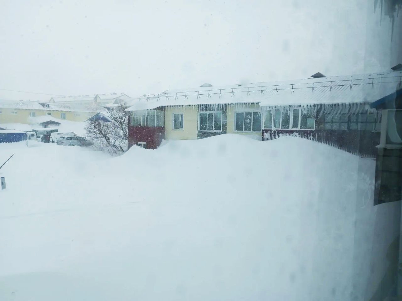 Снега намело так много, что первые этажи некоторых домой полностью скрылись из виду. Крыши домов буквально сравнялись с уровнем наметенных сугробов.