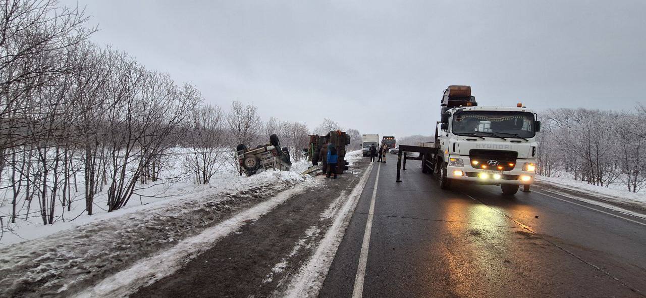 Грузовик и внедорожник перевернулись на въезде в Поронайск