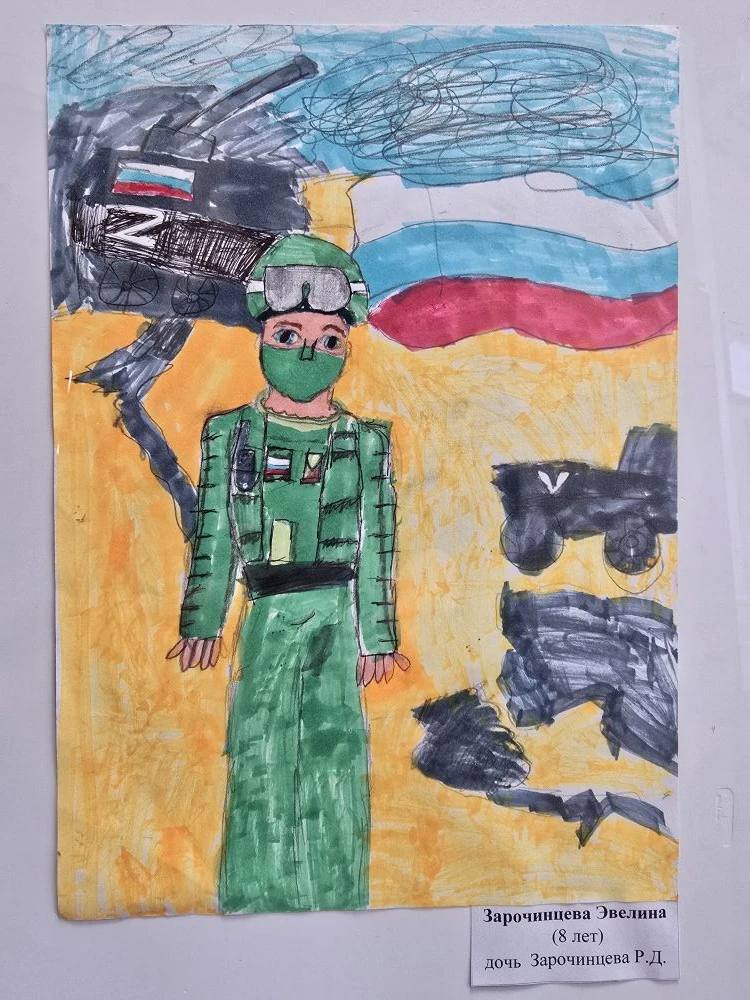Изображения военных, в том числе участников военной спецоперации, боевой техники, символики праздника пронизаны неподдельными детскими эмоциями от важности для всех нас этого праздника.
