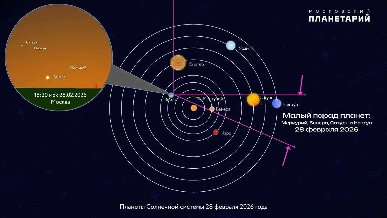"Именно эти четыре планеты (Сатурн, Нептун, Меркурий и Венера), которые располагаются в узком секторе неба, и составляют невидимый, из-за близости к Солнцу, малый парад планет 28 февраля 2026 года", - подчеркнули в Московском планетарии.
