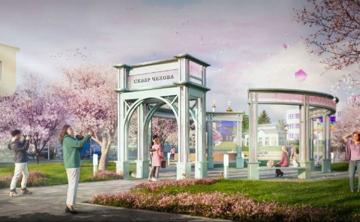 В обновленном общественном пространстве появится фонтан, современная детская игровая площадка и уютные зоны отдыха, оснащенные навесами и беседками. Для культурных мероприятий предусмотрят сцену и амфитеатр. Также в сквере организуют площадку для буккросинга и установят скульптуру, посвященную Антону Павловичу Чехову. Дополнят атмосферу высаженные деревья вишни и сакуры.