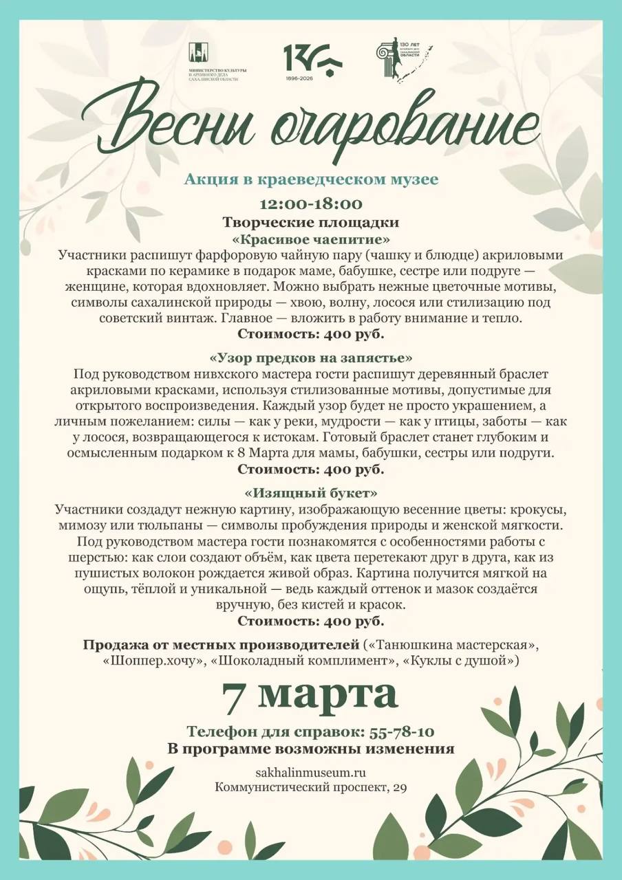 В субботу с 12:00 до 18:00 вас ждет предпраздничная акция «Весны очарованье». Подготовьтесь к Международному женскому дню с нашими мастер-классами.