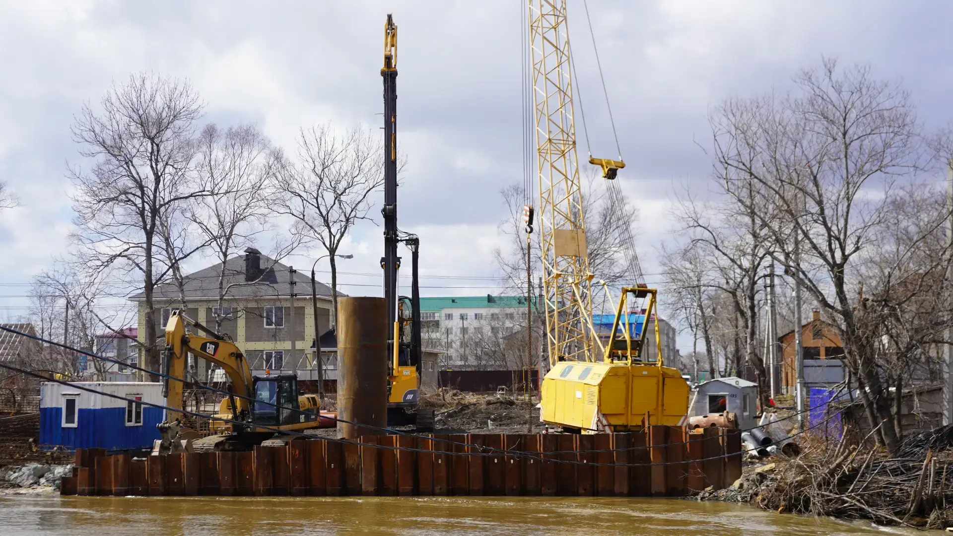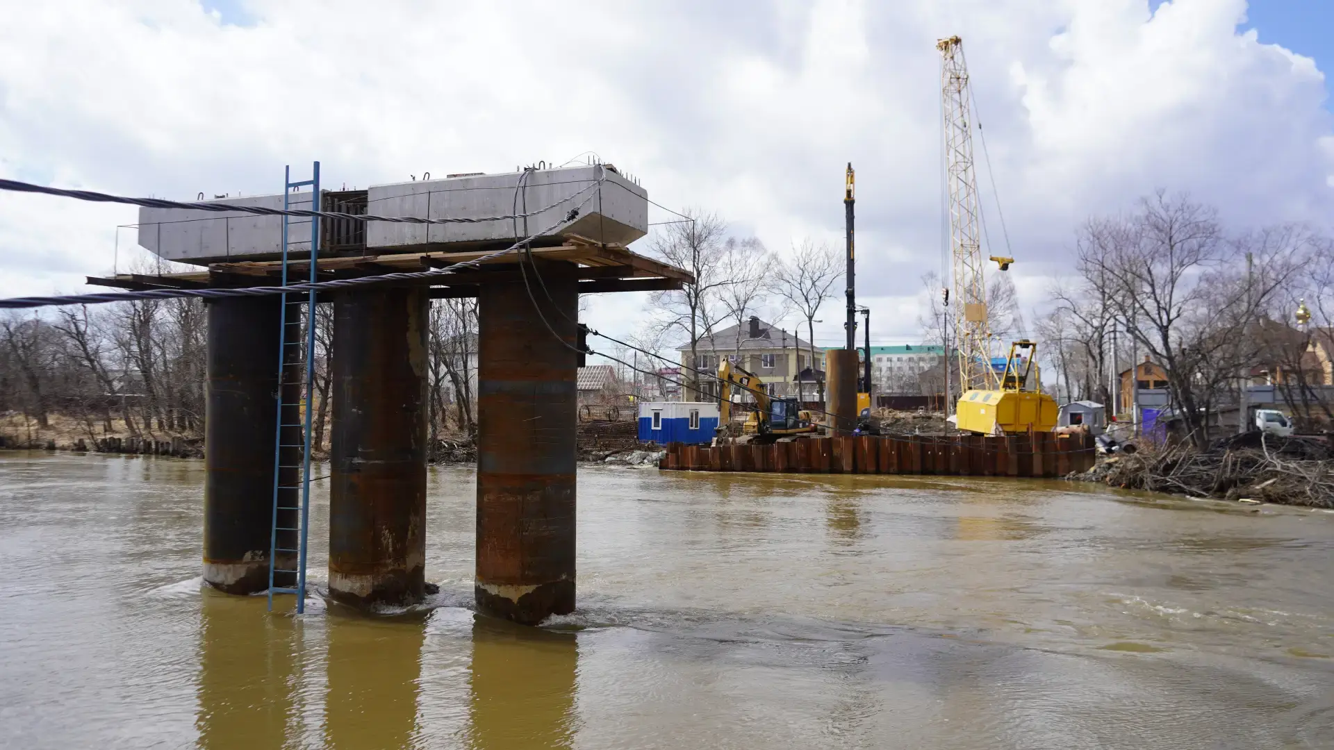 Подрядчик уже укрепил русло реки с левой стороны и провел отсыпку вблизи шпунтового соединения. Начато бурение второй береговой опоры со стороны улицы Дьяконова.