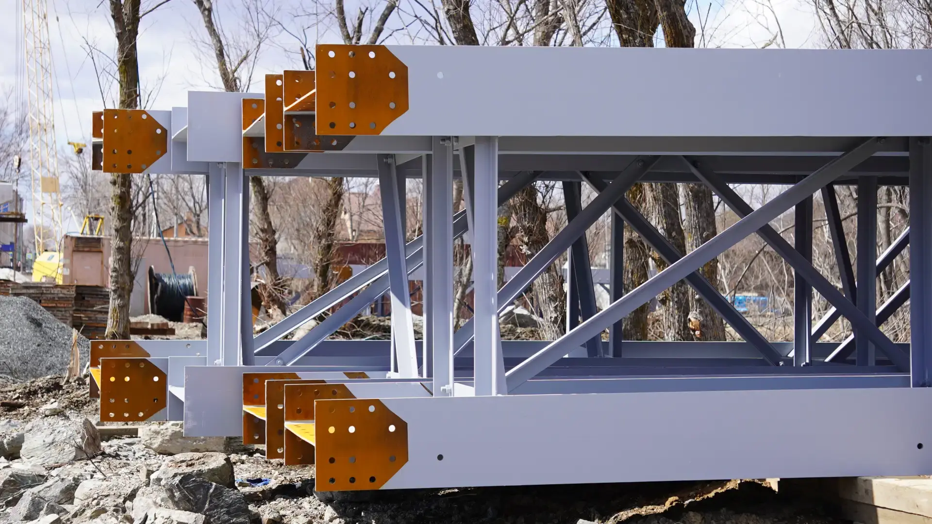 На строительную площадку доставлено пролетное строение. В ближайшее время рабочие приступят к его сборке и установке на опоры.