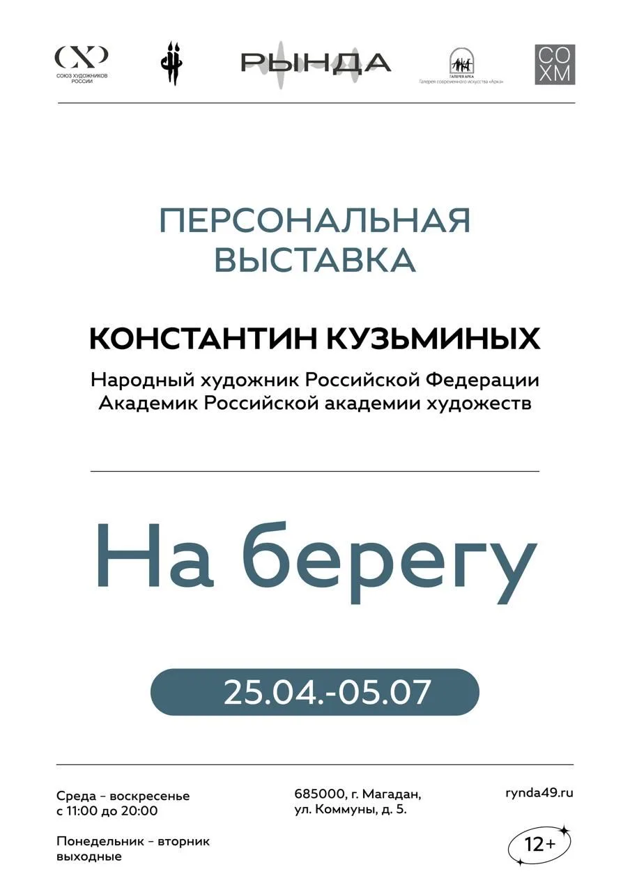 В Магадане, в культурно-выставочном центре «Рында» 25 апреля в 17.00 откроется персональная выставка Народного художника Российской Федерации и академика Российской академии художеств Константина Кузьминых «На берегу» (12+). Экспозиция будеть работать до 5 июля 2026 года.