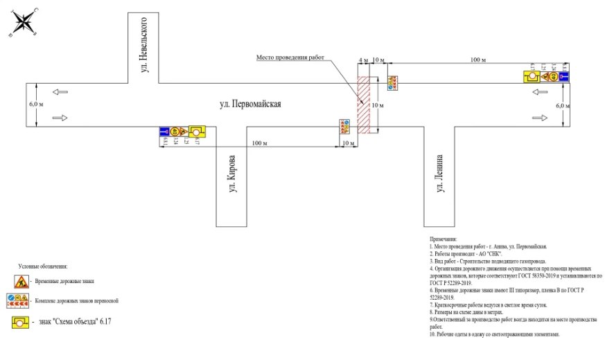 Кроме того, 30 апреля с 9:00 до 18:00 будет перекрыт участок улицы Первомайской. Ограничения связаны с работами по строительству подводящего газопровода (нижняя схема).