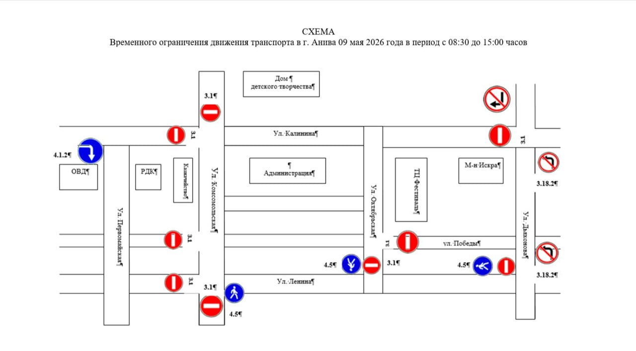 В связи с празднованием 81-й годовщины Великой Победы 9 мая в Аниве будут частично перекрыты дороги. Так, с 8:30 до 15:00 будет закрыт проезд по улице Калинина от Дъяконова до Первомайской.