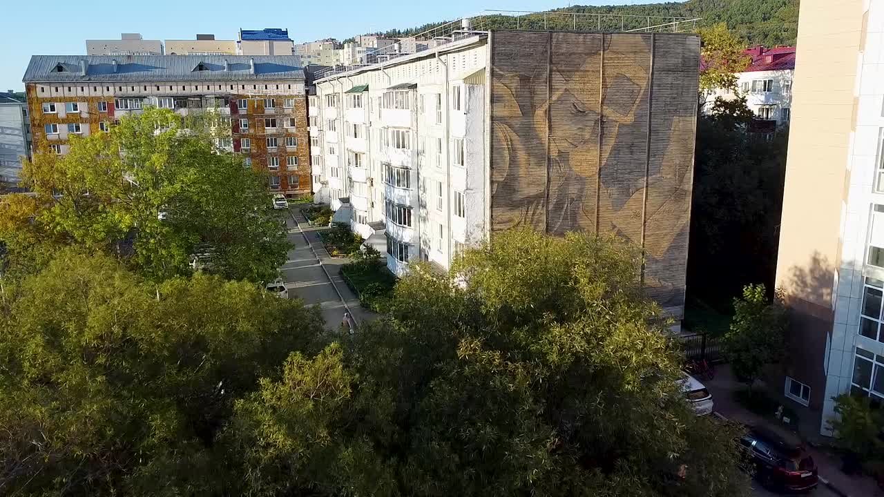 На доме №13 завершились работы над необычной фреской. В рамках второго сезона паблик-арт программы «Взгляды» Антуан Гиньяр создал в авторской технике арт-объект на дереве. Шведский художник вырезает изображения, прорабатывая светлые участки дерева, не трогая тёмные. На этой фреске он изобразил ребёнка, который смотрит на карту и изучает мир.