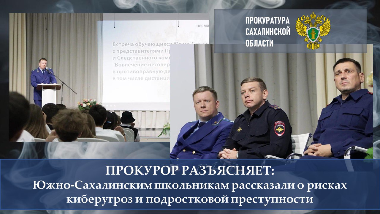 Прокурор Южно-Сахалинска Антон Травин совместно с начальником Управления МВД России по городу Юрием Харченко и исполняющим обязанности руководителя следственного отдела Следственного комитета России по Сахалинской области Олегом Горбачевым провели встречу с учащимися 7–8-х классов города Южно-Сахалинска.