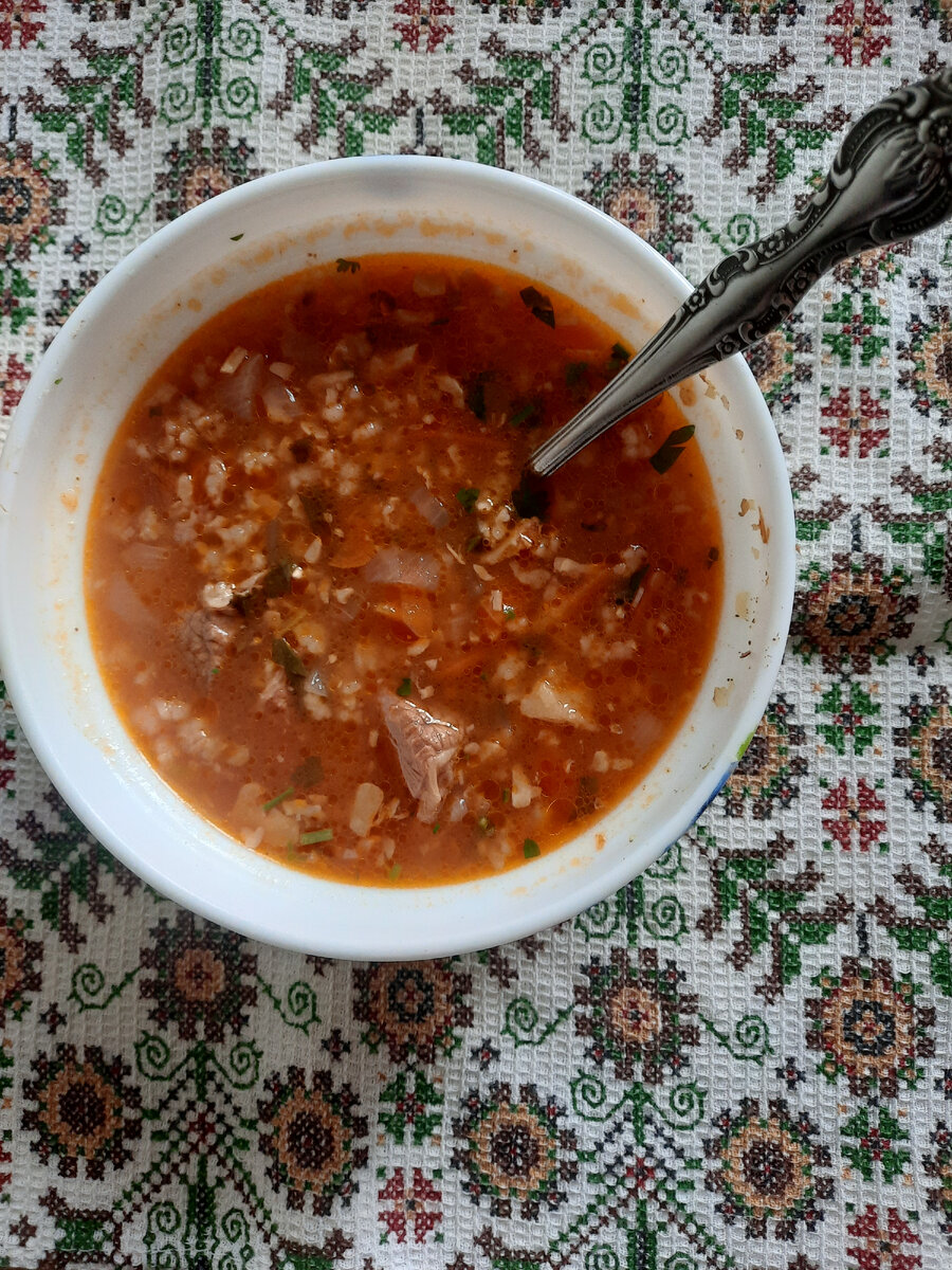 Как только мясо станет мягким, его нужно вынуть, отделить от костей и нарезать крупными кусками. В бульон добавляется промытый рис, а затем, через 10 минут, томатная паста и сливовый соус. Все это варится ещё около 10 минут, после чего возвращается мясо обратно в кастрюлю.
