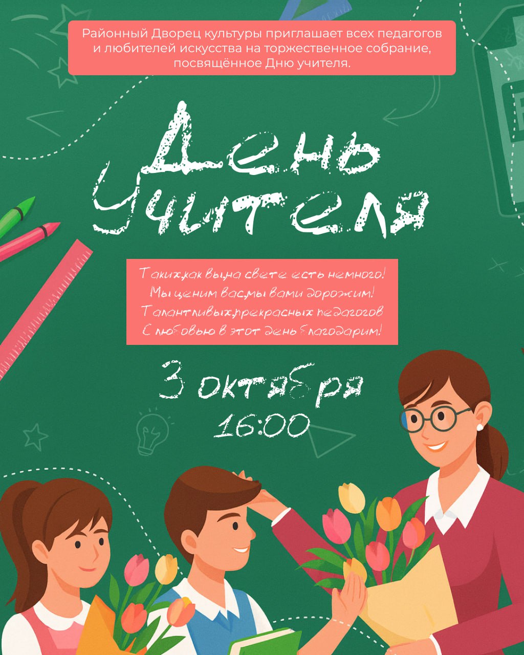 Районный Дворец культуры приглашает всех педагогов и любителей искусства на торжественное собрание, посвящённое Дню учителя!