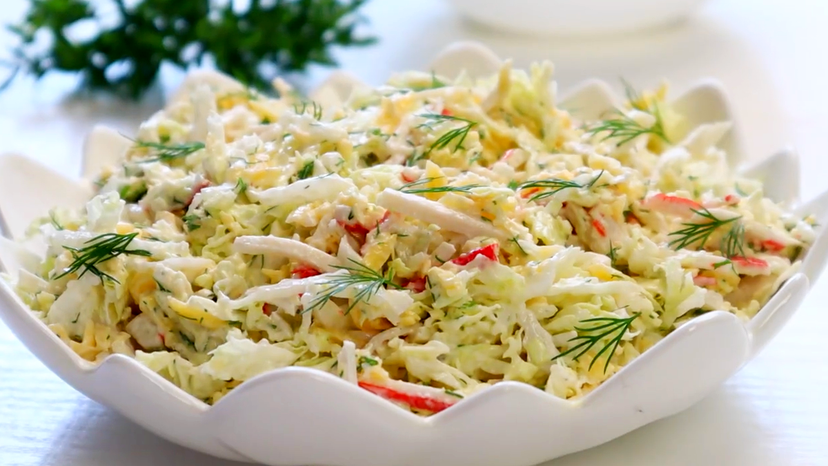 Приготовление начинается с нарезки нежной части пекинской капусты. Крабовые палочки можно нарезать тонкой соломкой – это не только увлекательней, но и делает текстуру салата более интересной. Все ингредиенты выкладываются в просторный салатник.
