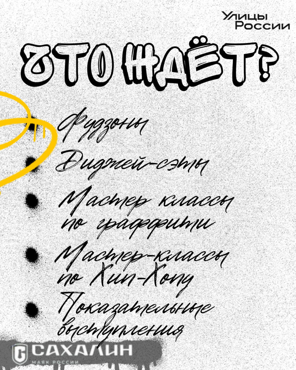 Готовьтесь к мощному драйву – вас ждут зажигательные диджей-сеты, граффити-баттлы с участием лучших райтеров Сахалина и других городов России, а также крутой мастер-класс по хип-хопу от Вити Ляо из Владивостока.