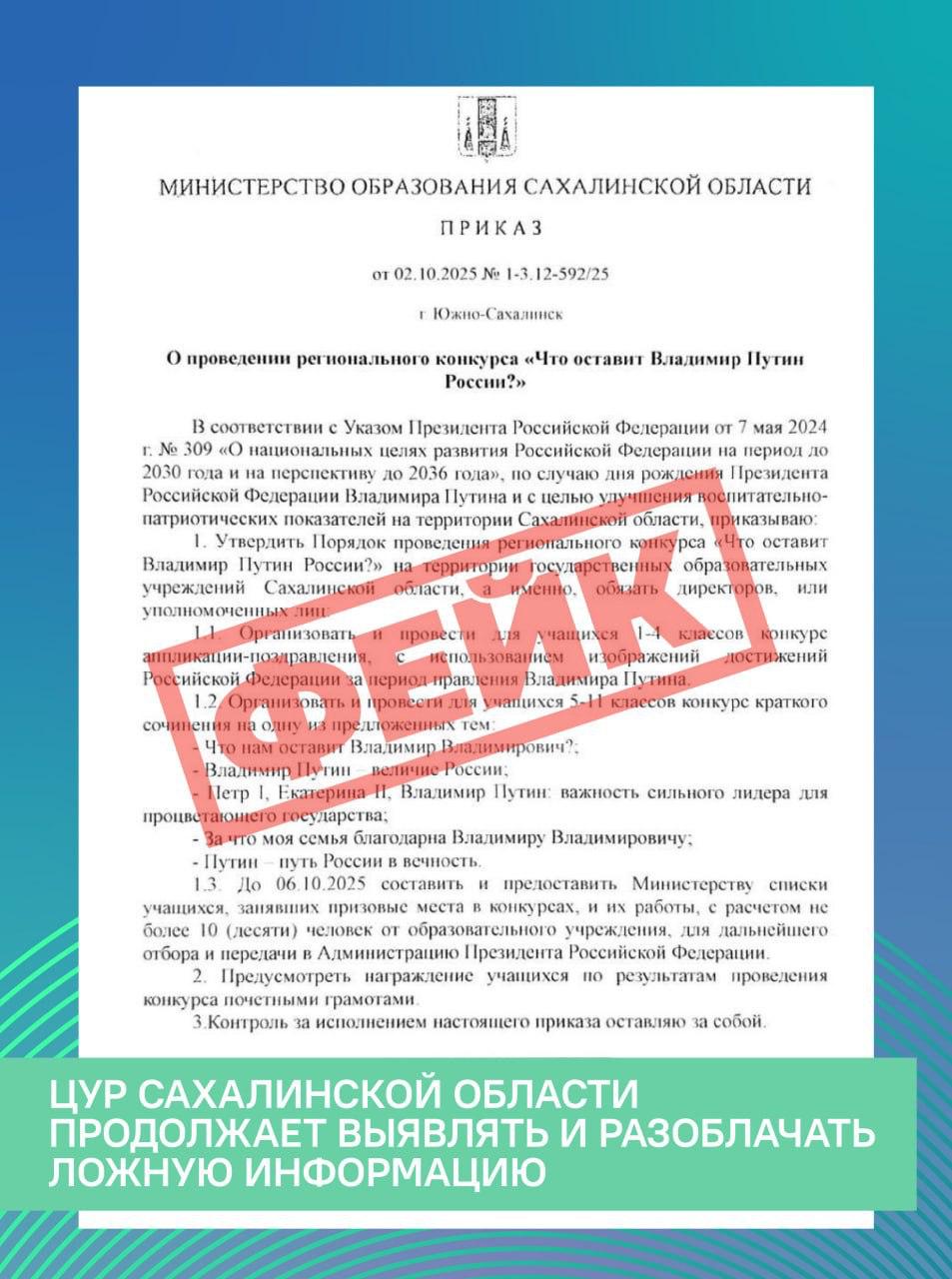 Фейковый приказ о конкурсе сочинений «Что оставит В. Путин России?» распространяют на Сахалине — ЦУР