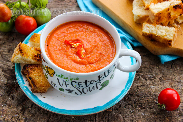 После запекания дать овощам немного остыть, затем удалить шкурку с помидоров и перца. Запечённый чеснок добавить в блендер вместе со всеми остальными овощами (кроме чили) и измельчить до состояния пюре. Чили вводится постепенно, в зависимости от желаемой остроты. Теперь гаспачо готов к подаче – его можно упростить порцией гренок, что станет идеальным завершением этого зимнего блюда.