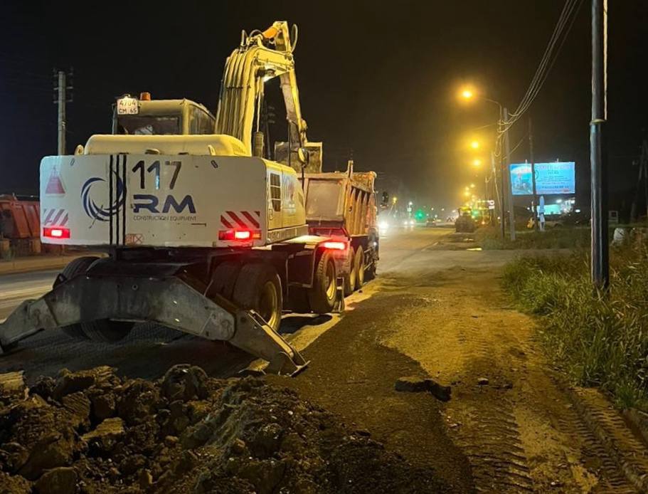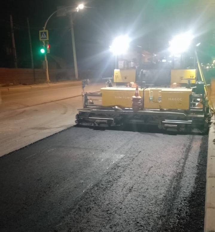 Второй объект - Холмское шоссе. Здесь работаем несколько недель , но и объем один из самых больших за год. Уложили уже порядка 10 тысяч кв. метров асфальта. Осталось ещё около 2 тысяч. Проводим ночью, чтобы не мешать движению автомобилей. Покрытие укладываем сплошным слоем, чтобы максимально сохранить прочность. Также в самых проблемных местах провели замену пучинистых грунтов.