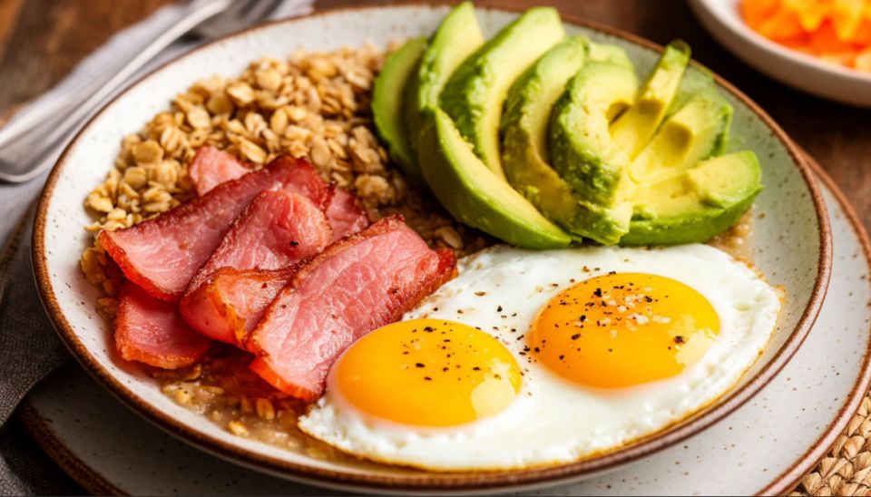 - Понедельник: жареные яйца с авокадо, ветчина и овсяная каша. Данный завтрак полноценно насытит, обеспечивая организм белками, полезными жирами и сложными углеводами.