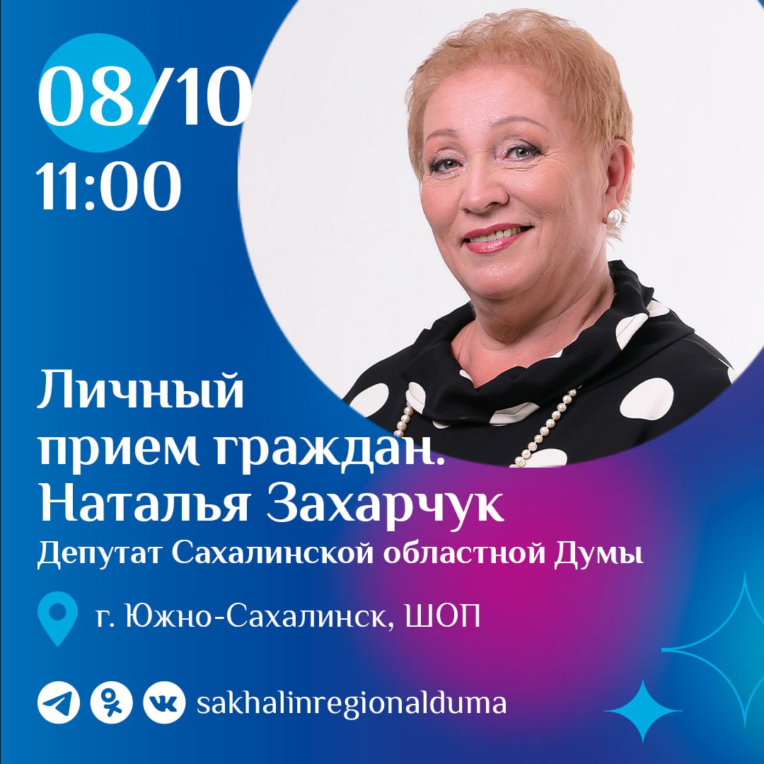 Председатель постоянного комитета по бюджету и налогам Наталья Захарчук проведет личный прием граждан. Прием пройдет в среду, 8 октября, с 11:00 до 12:30 в Штабе общественной поддержки партии «Единая Россия» по адресу: город Южно-Сахалинск, улица Дзержинского, 40/1.