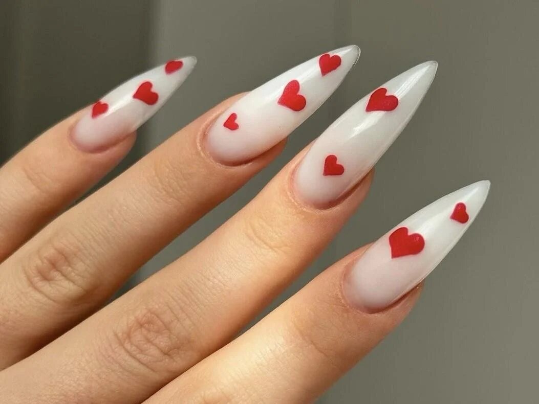 Тем, кто любит выделяться, подойдет маникюр в стиле граффити. Красно-белые слова как "Amor", "Love" и "Любовь" на ногтях создадут эффект, словно они раскрашены на стене. Это смелое решение примет среди окружающих, отражая индивидуальность и романтическое настроение. Также, в моду входит маникюр с клубникой и сердечками — насыщенный красный цвет служит основой, а смешанные с ним аккуратные капельки и объемные сердечки добавляют игривости.