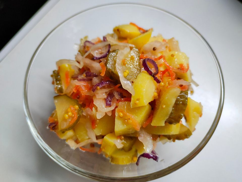 Для начала вареную картошку следует нарезать. Соль и перец можно добавлять по желанию, в зависимости от предпочтений. Главное помнить, что капуста и огурцы уже содержат соль, поэтому добавлять ее в картофель можно в минимальных количествах.