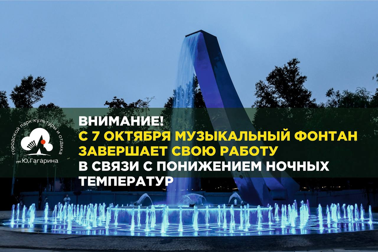С 7 октября музыкальный фонтан завершает свою работу в связи с понижением ночных температур и приступает к техническому обслуживанию перед зимним хранением.