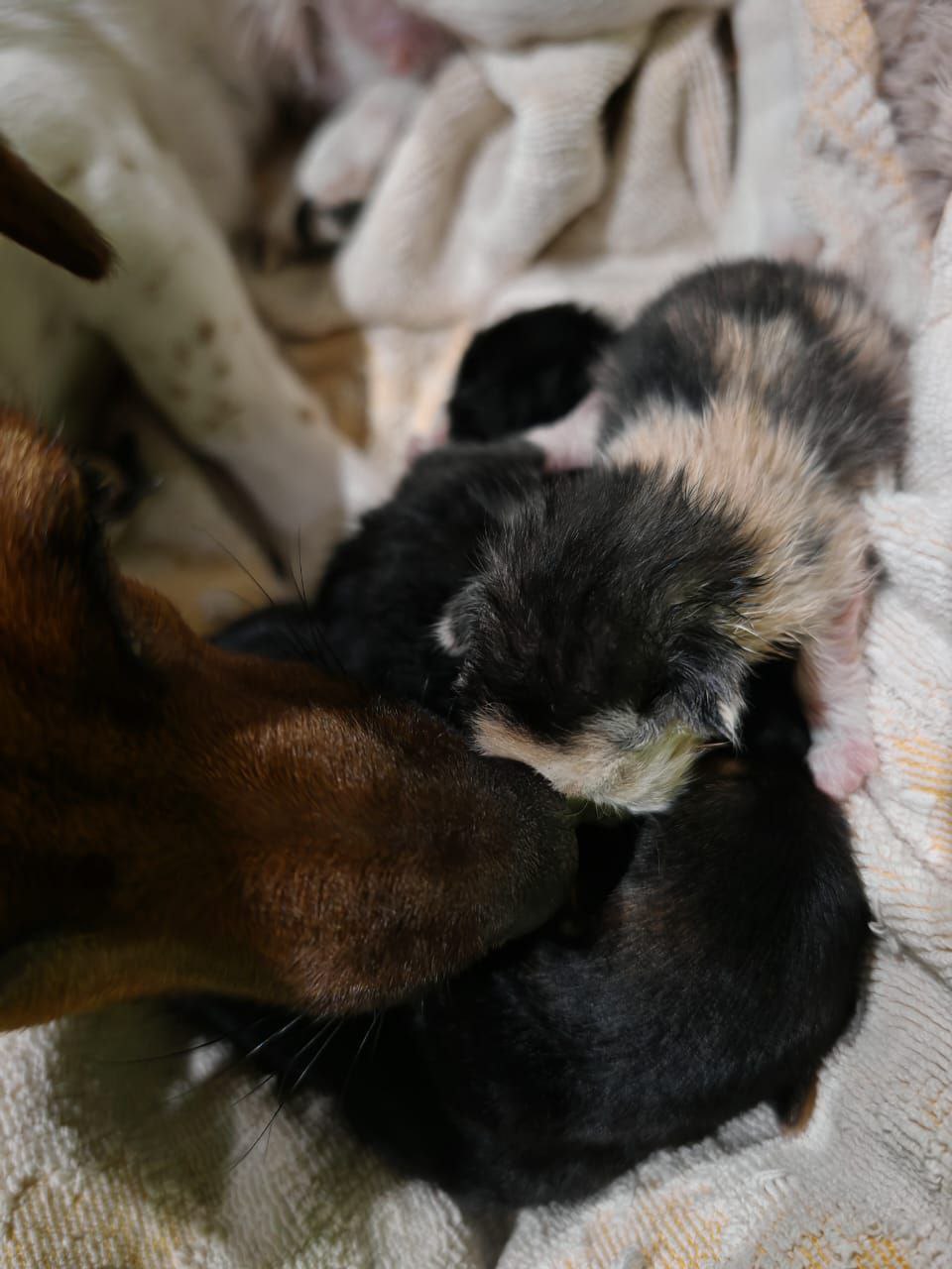 Нашли котятам мамку кормящую! Правда, эта мамка — собачка джек-рассел. Но разве это имеет значение... Котяток приняла, дай Бог вс получится,