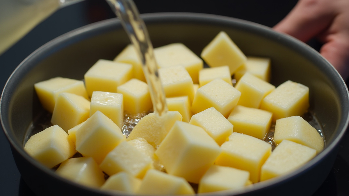 Когда картофель оказывается на кухне, первым делом его следует очистить и нарезать крупными кубиками, чтобы они не разварились. После этого их можно отварить в подсоленной воде — это займет всего 15 минут. Важно дать картофелю немного остыть после варки, чтобы текстура блюда была более плотной. Затем к теплым кусочкам добавляется масло, которое сделает их ещё более нежными, а также пряная куркума, способная поднять настроение одним своим цветом.