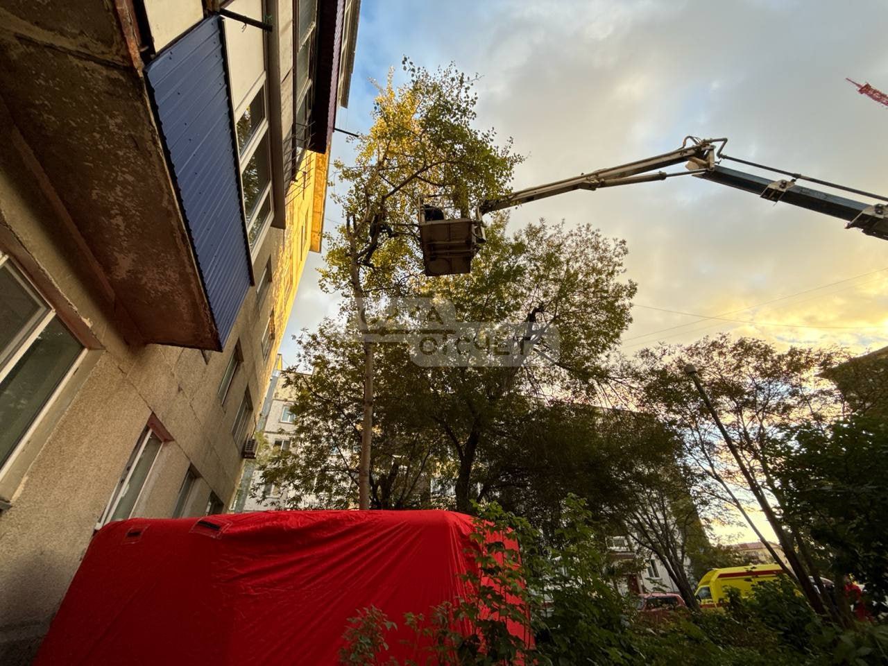 В Южно-Сахалинске у дома №17 по улице Победы произошёл странный инцидент — на уровне пятого этажа на дереве застрял мужчина. Он держался на верхушке, зацепившись ногой за ветку, и звал на помощь.
