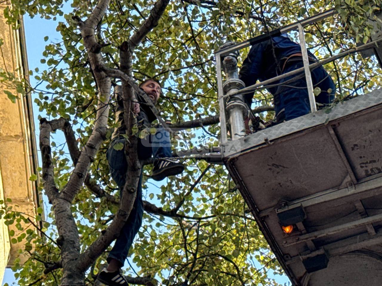 Под деревом развернули «куб жизни», а с помощью пожарной люльки мужчину благополучно сняли.